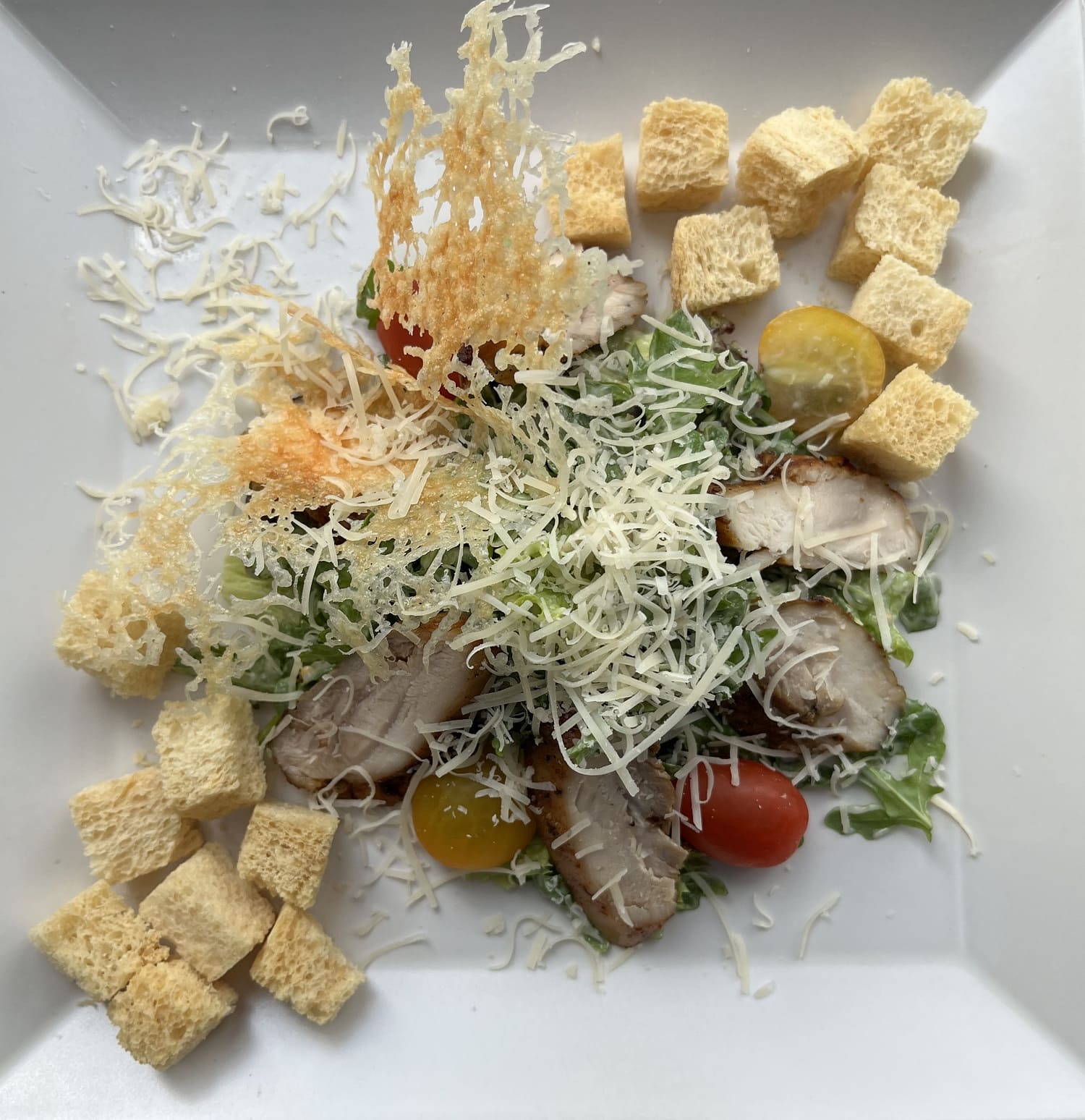 Мікс салату, куряче стегно запечене, помідори чері, соус Цезар, сухарики з білого хліба, чіпса з пармезана та тертий пармезан, спеціі