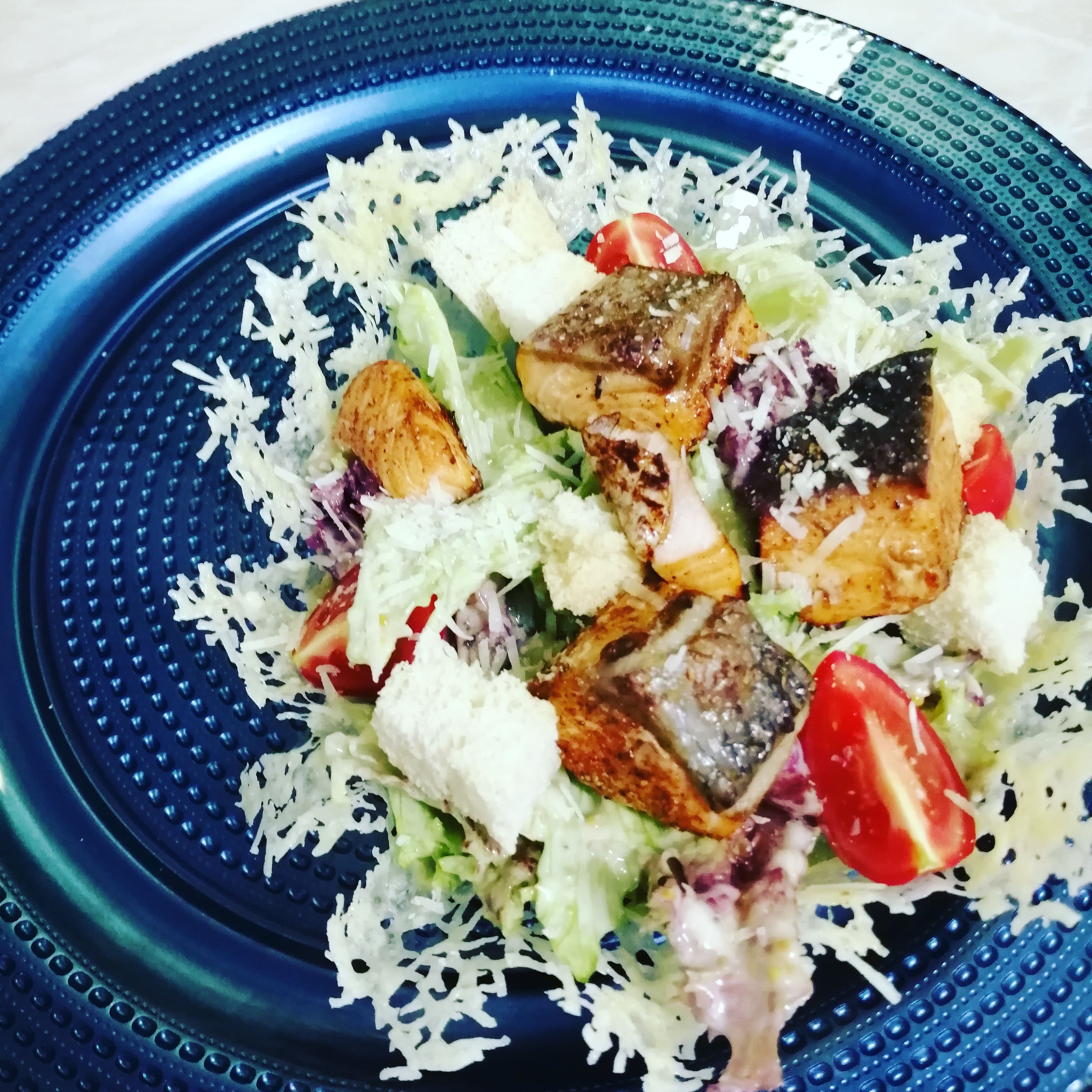 Мікс салату, помідори чері, лосось, соус Цезар, корзинка з пармезану, сухарики з білого хліба, тертий пармезан