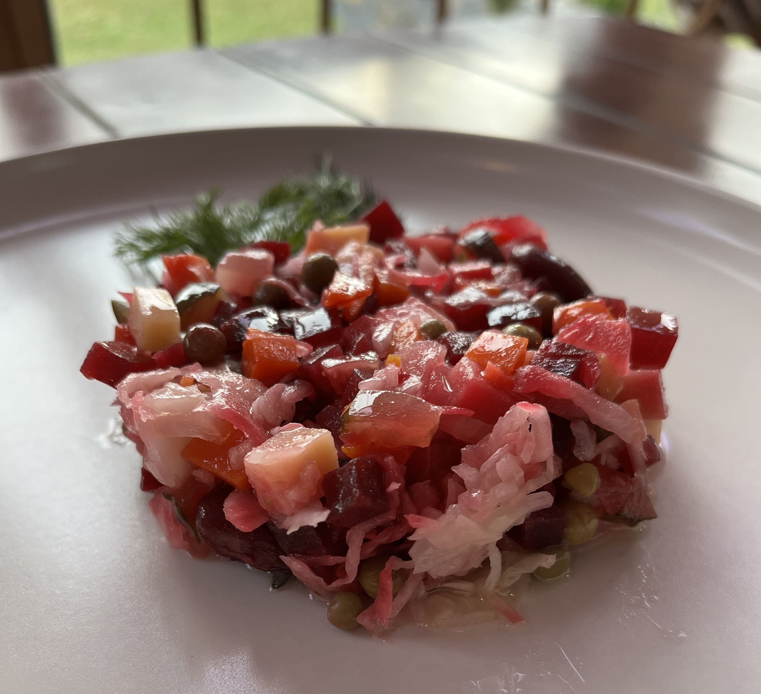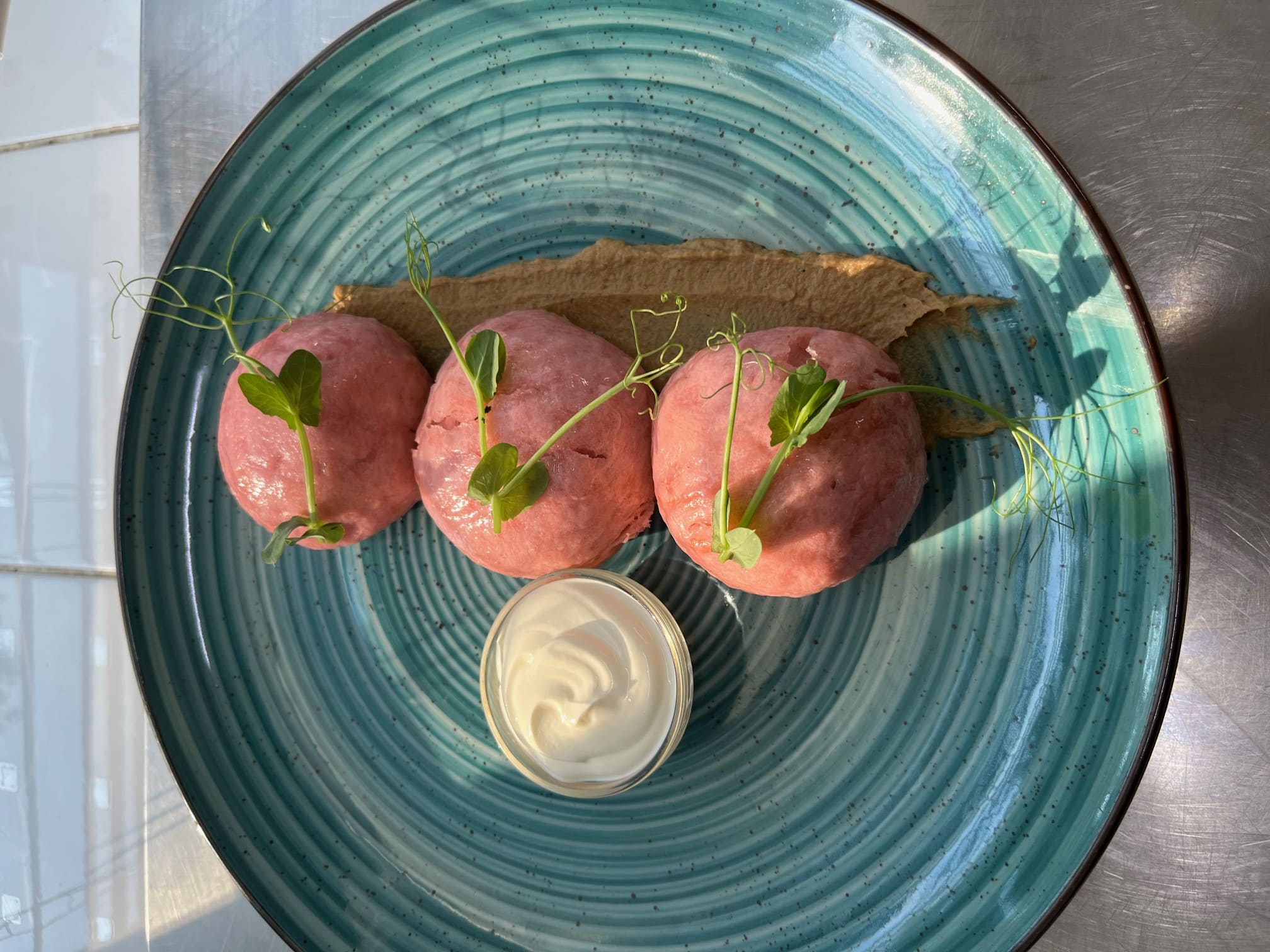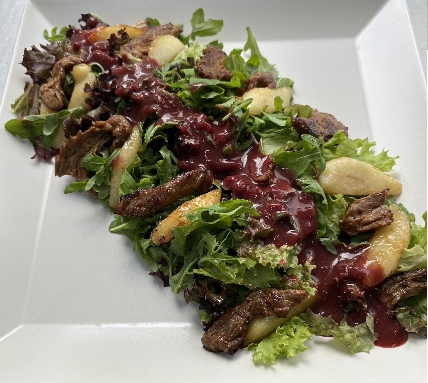 Мікс салату, телятина, спеціі, гостриц маринад, груша, цукор, соус з Журавлини