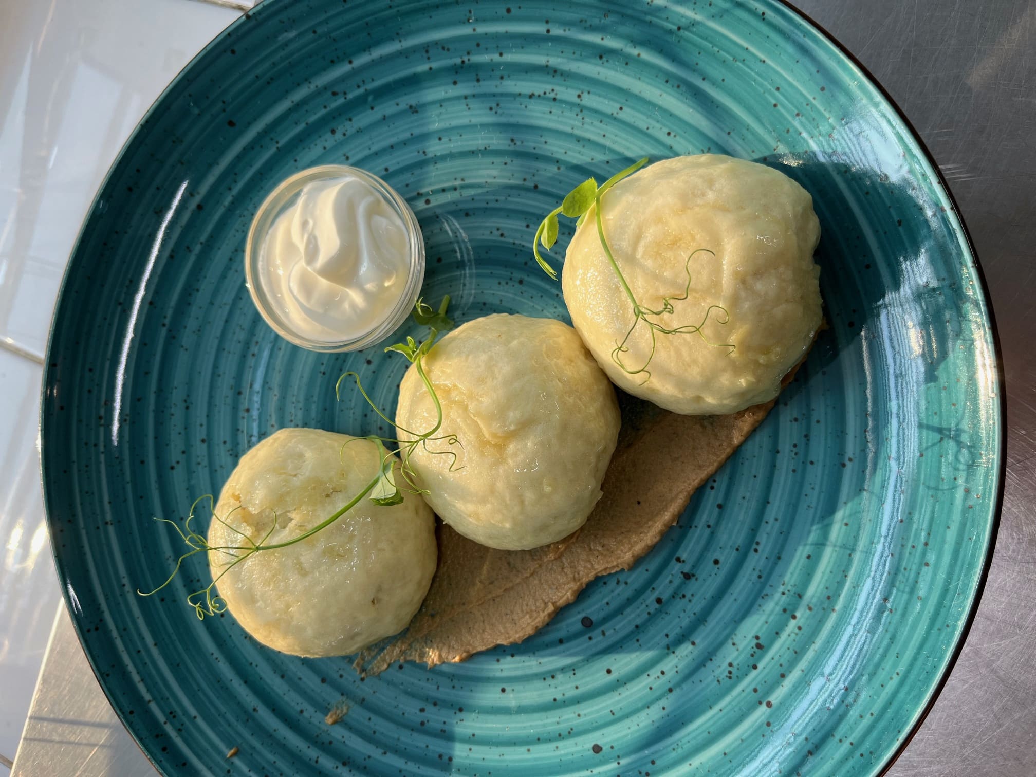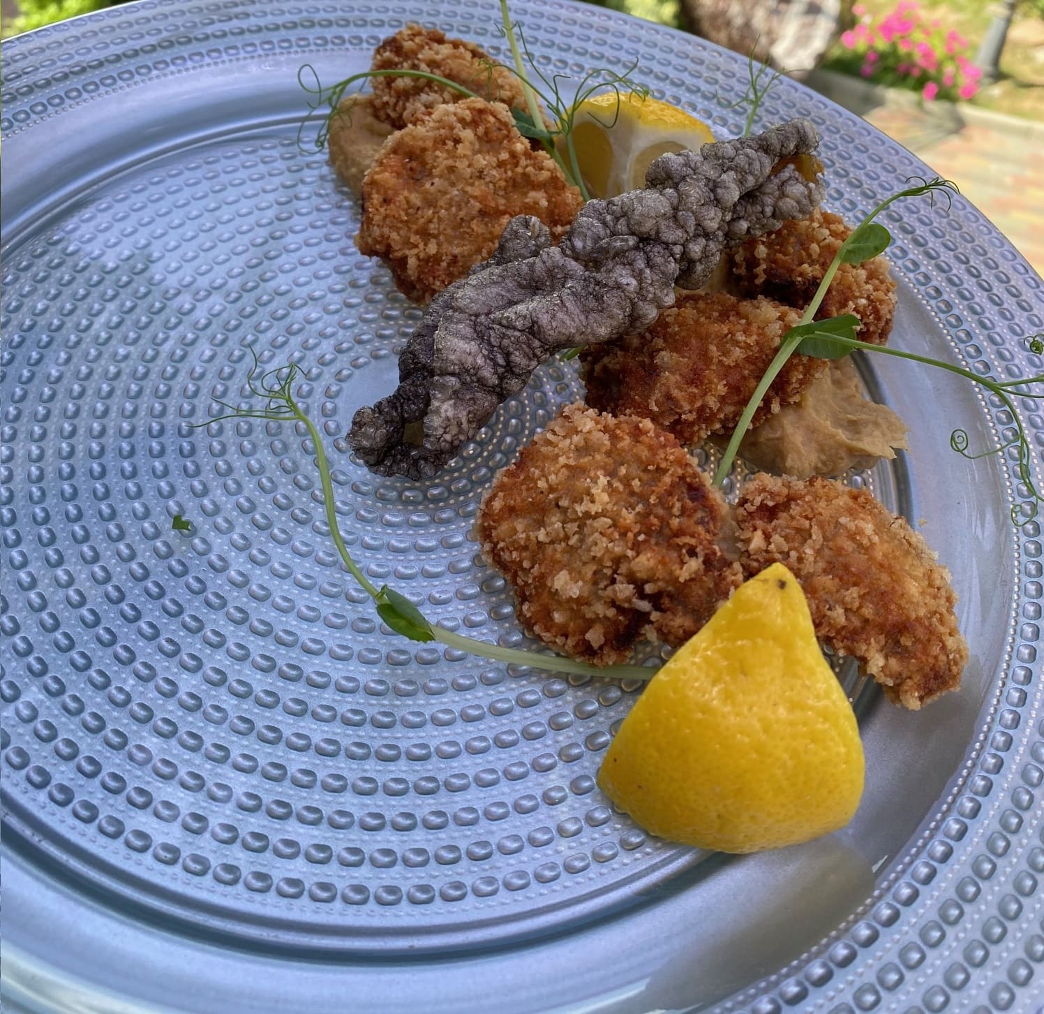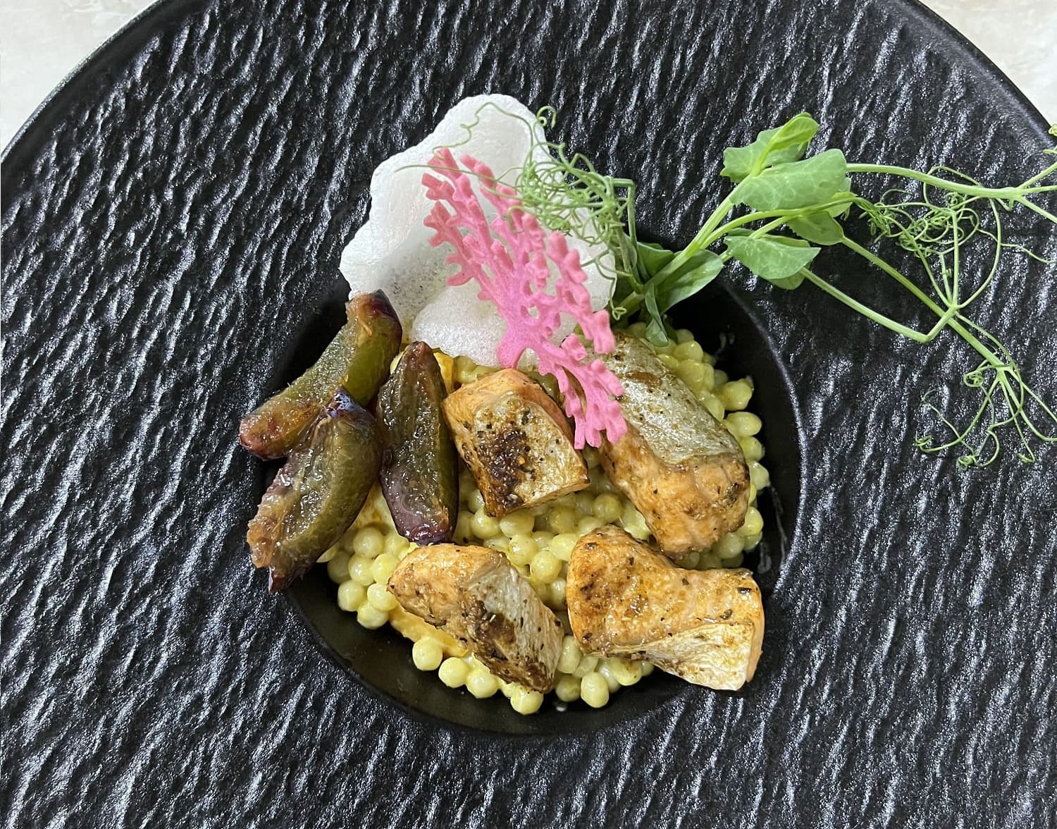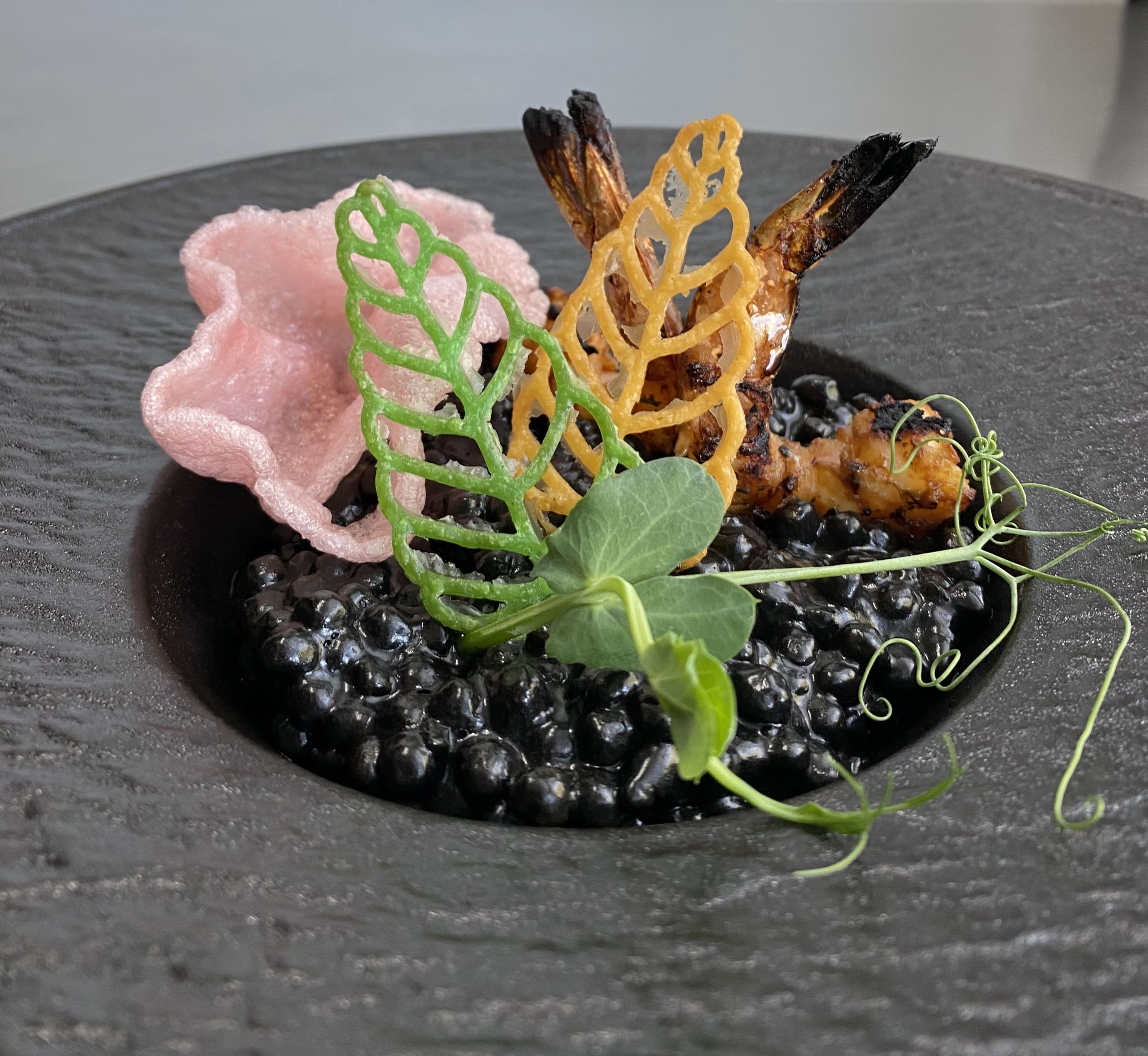 Качана каша, вершки, чорнила каракатиці, креветки, мідіі, лосось, креветочна чіпса та підсолена слива, сіль, спеціі