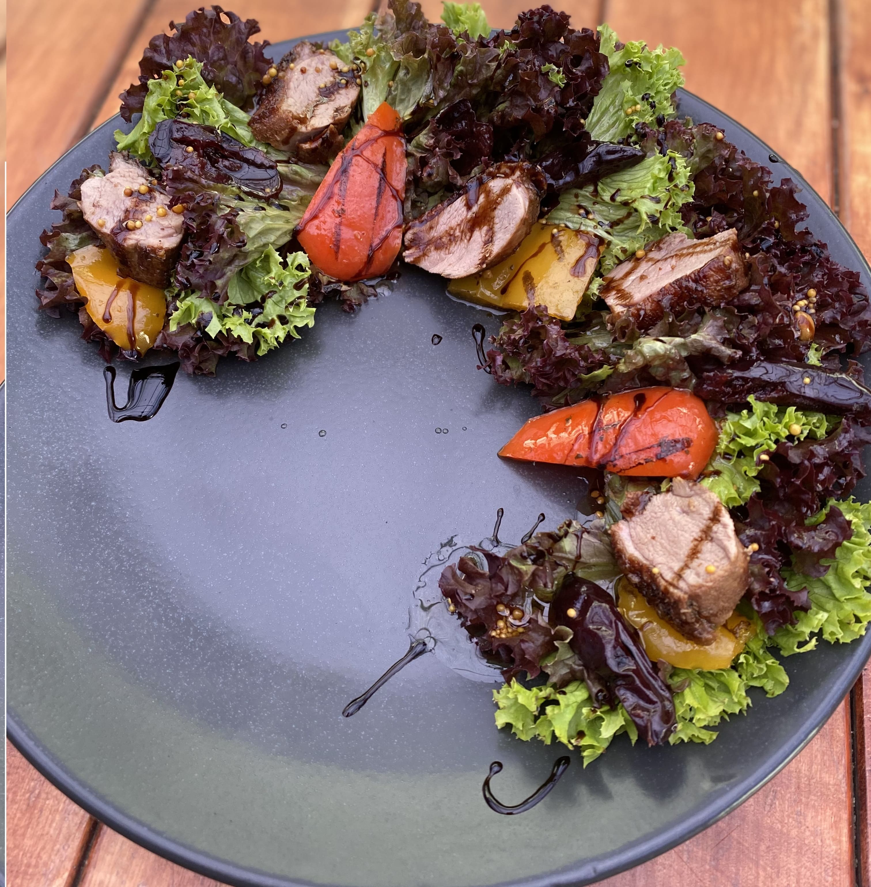 Мікс салату, качине філе запечене, перець гриль, підсолена слива, гірчична олія, соєвий соус, гірчиця зерна та крем бальзамік