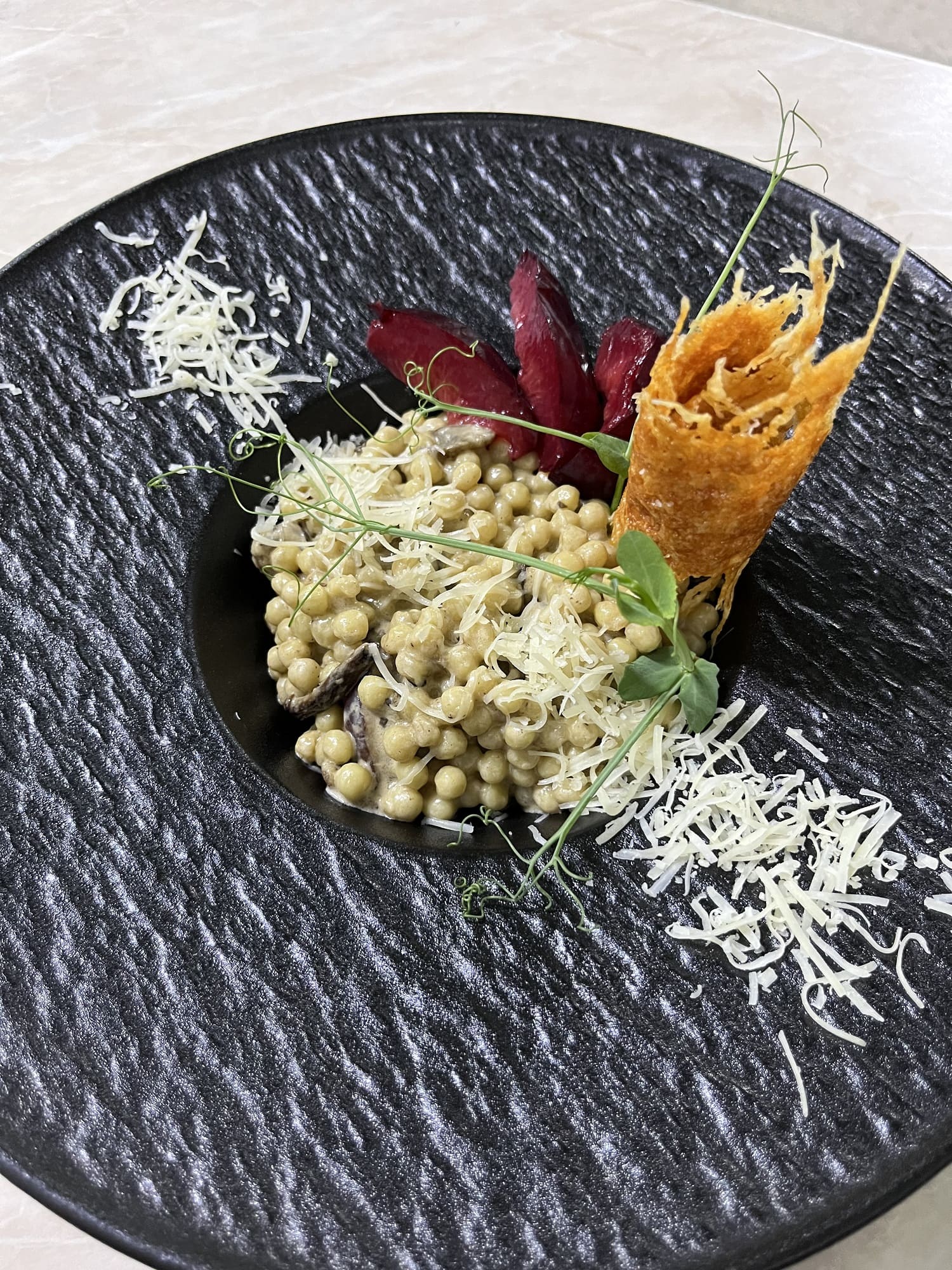 Качана каша, суміш лісових грибів, вершки, сир пармезан, підсолена слива, сіль, спеціі