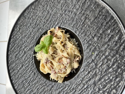 макарони тальятелле, грудина копчена, вершки, пармезан