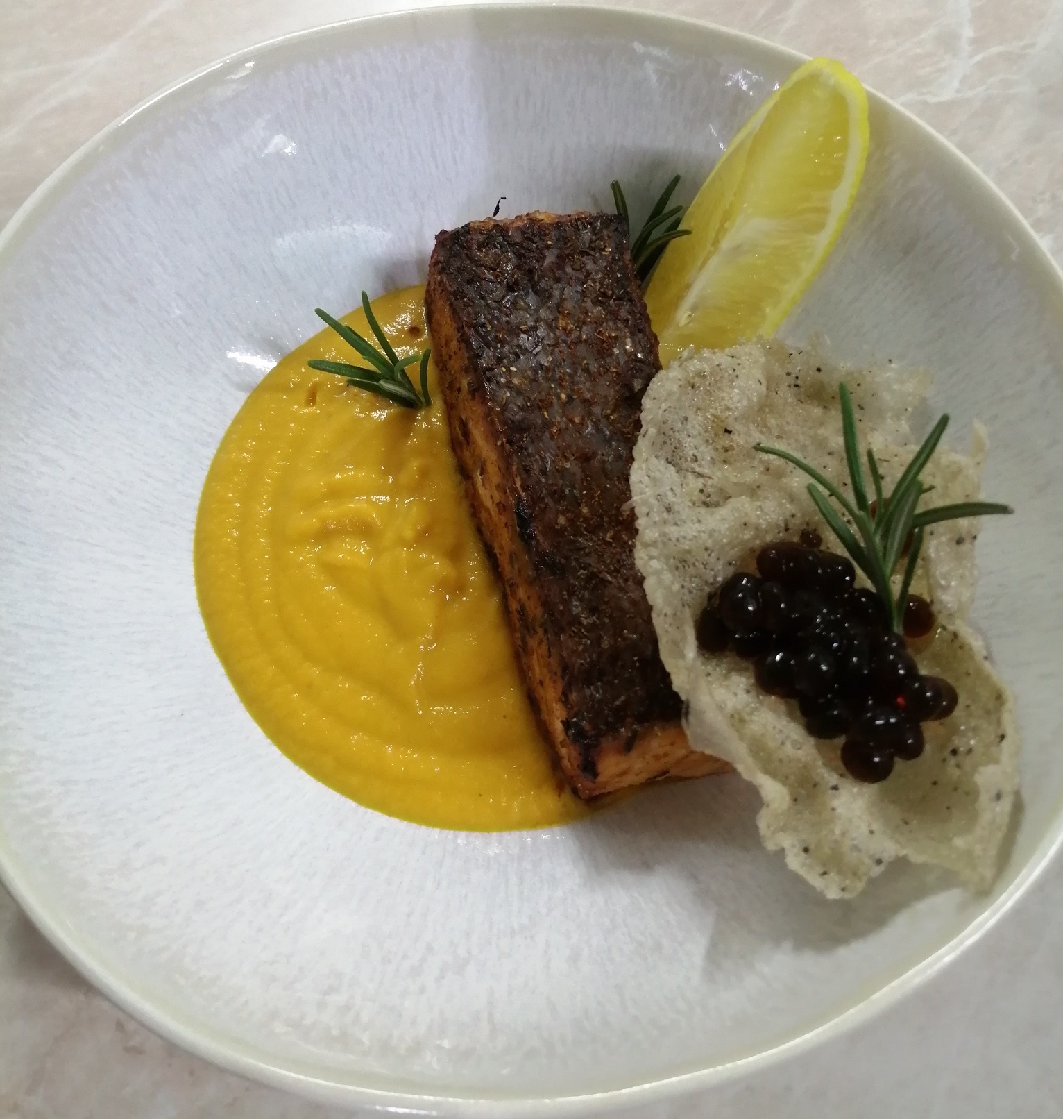 Качана каша, лосось, гарбуз, вершки, креветочна чіпса, підсолена слива, сіль, спеціі