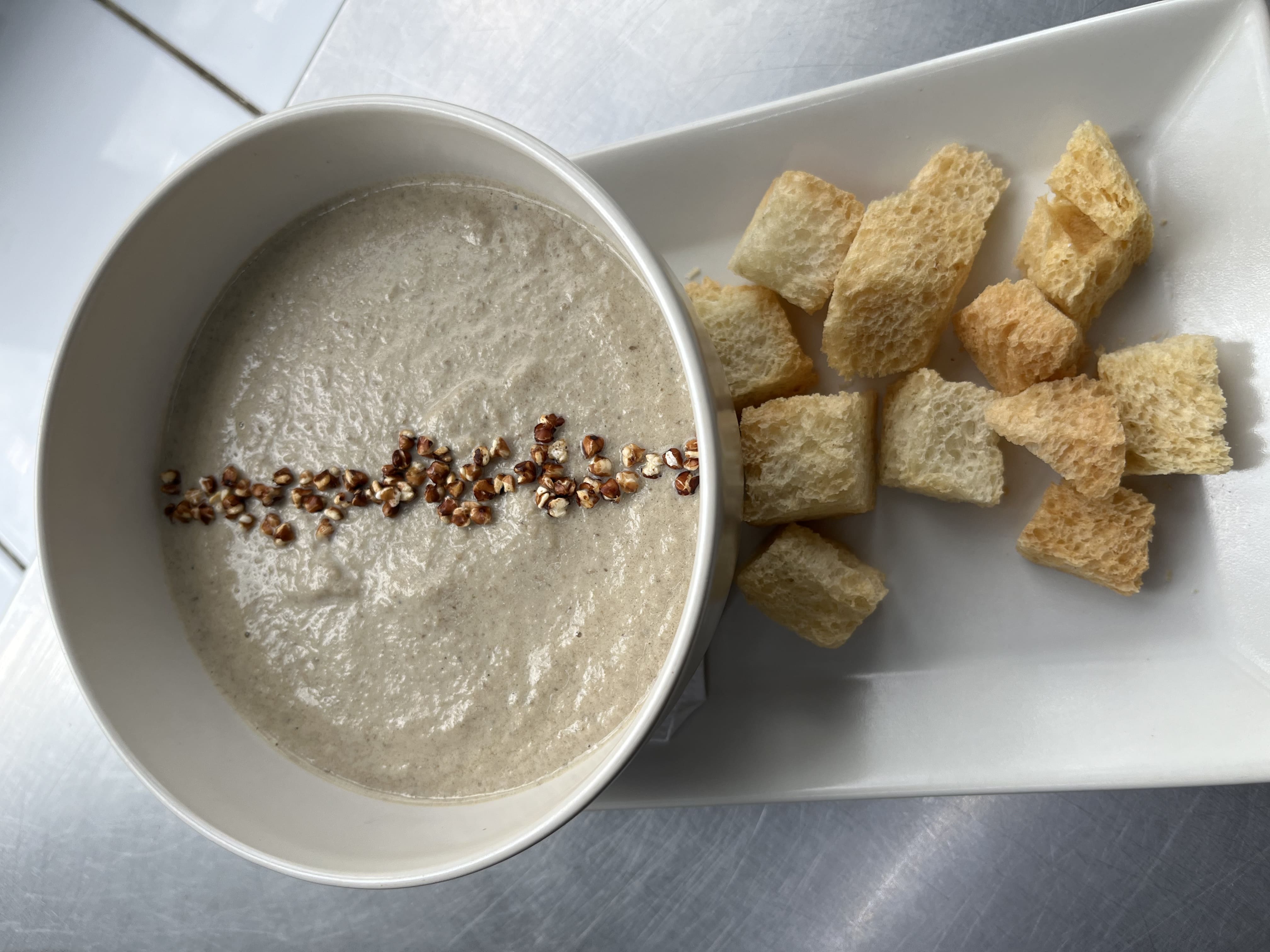 Склад Шампіньони,цибуля ріпчаста,вершки,смажена гречка,сухарики з білого хліба,сіль,спеціі