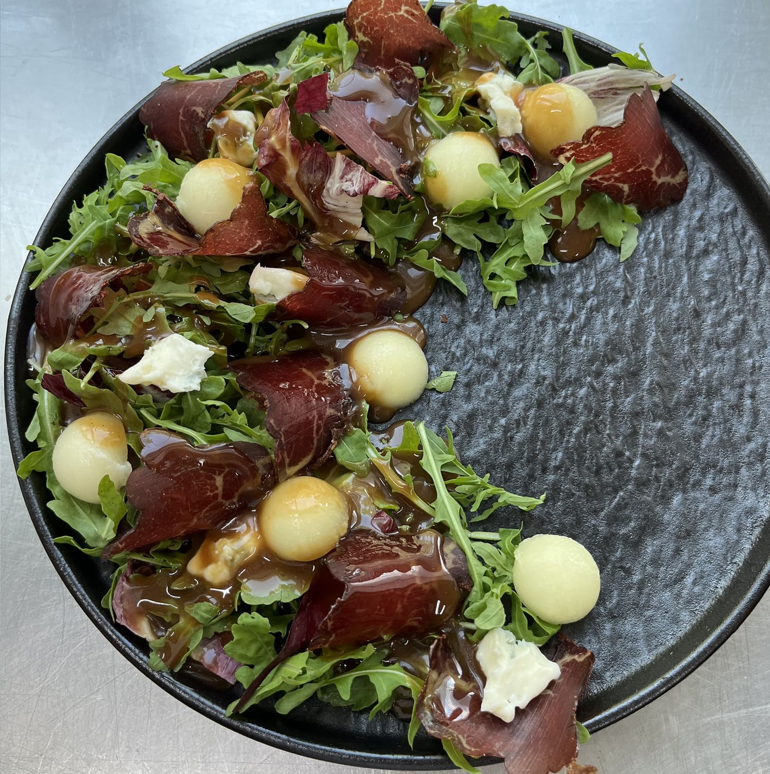 Мікс салату, диня, сир горгонзолла, бастурма та соус з оливковою олією, медом та бальзамічним оцтом