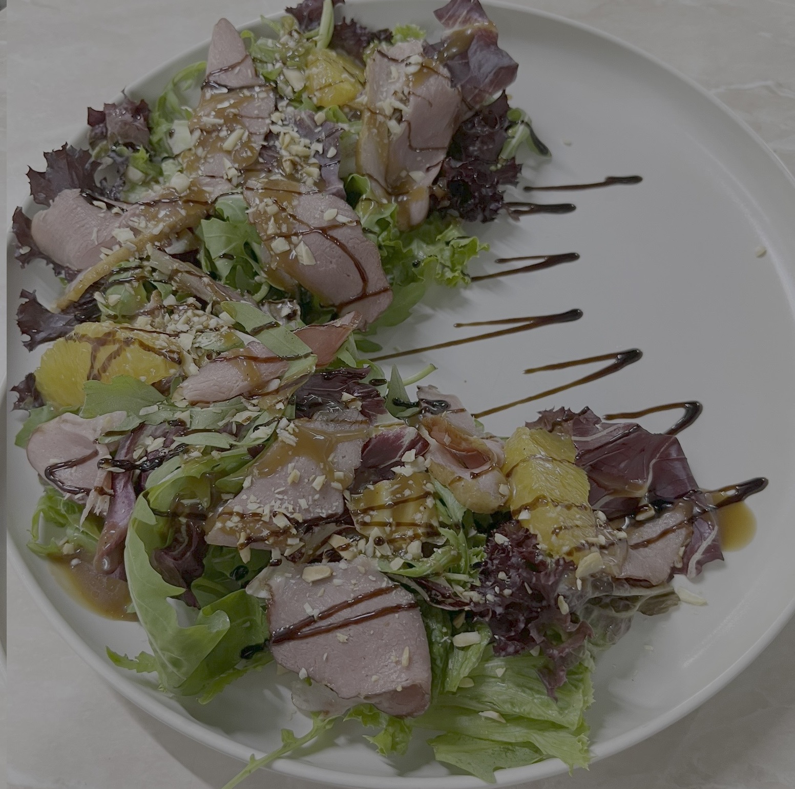 Мікс салату, філе качки копчене, філе апельсину, сажене кеш'ю та соус з оливковою олією, медом та бальзамічним оцтом