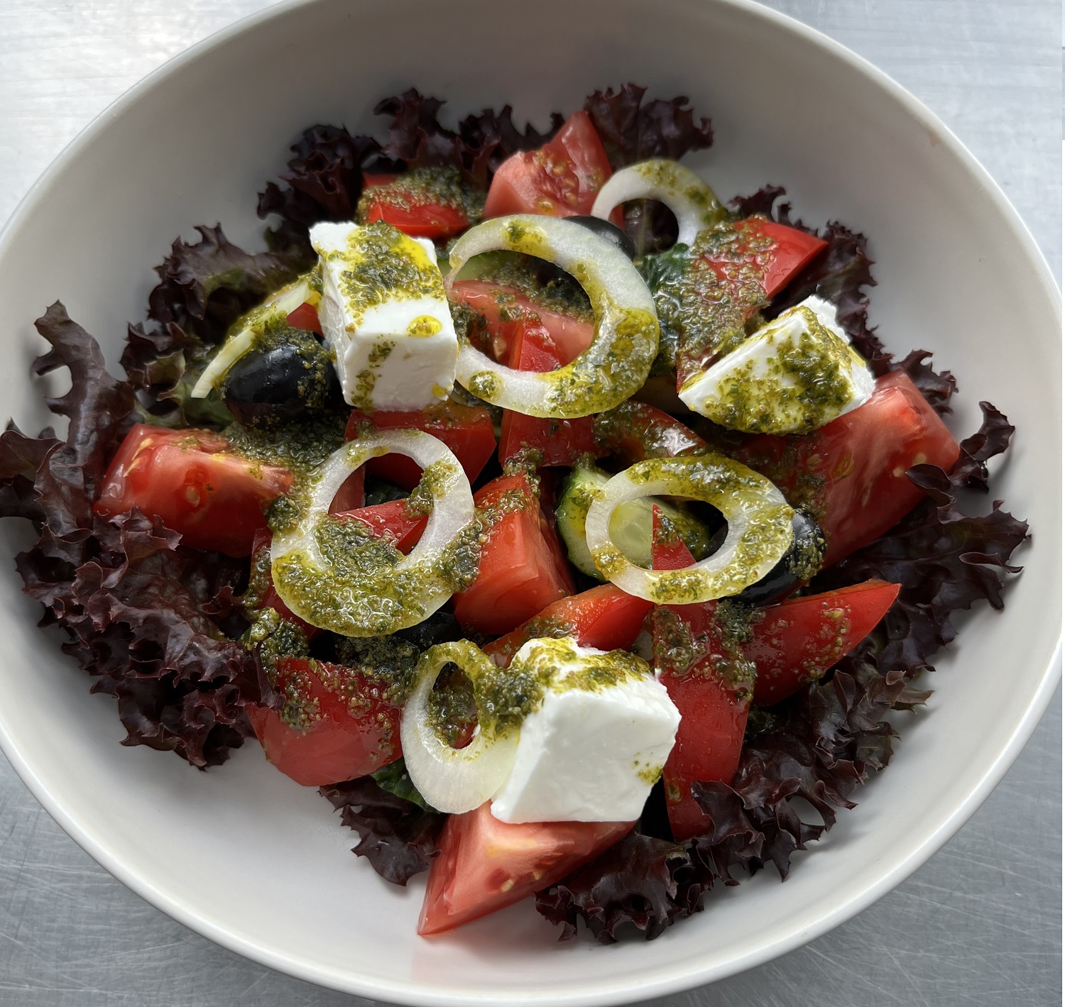 Листя салату, огірок, помідор, перець болгарський, маслини, сир фета, салатна цибуля та соус Песто