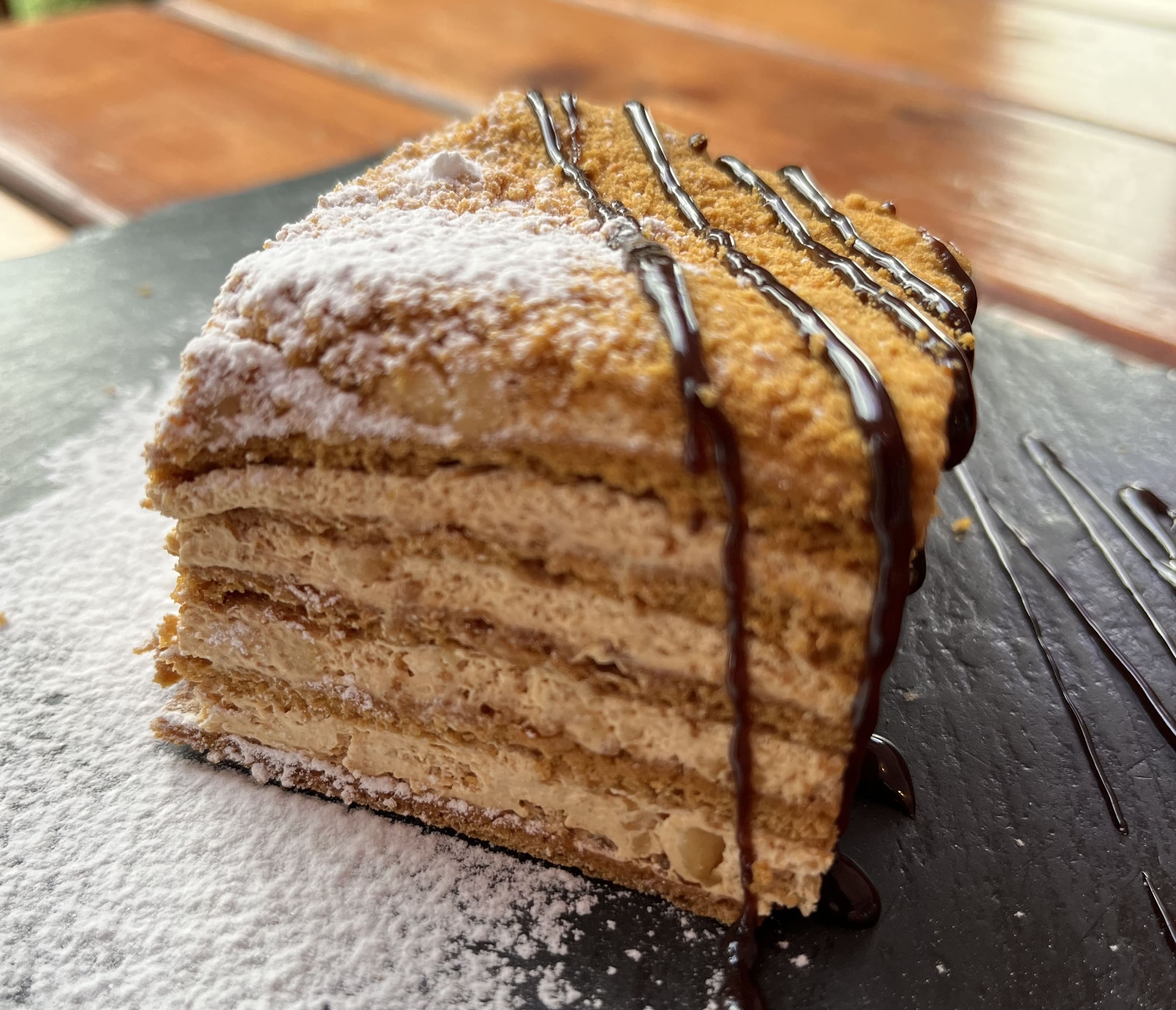Мікс салату, диня, сир горгонзолла, бастурма та соус з оливковою олією, медом та бальзамічним оцтом